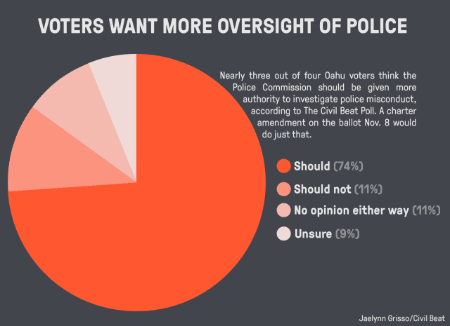 Nearly three-fourths of Oahu voters surveyed for The Civil Beat Poll say the Honolulu Police Commission should be given greater authority to suspend or dismiss the chief of police and to investigate police misconduct.
