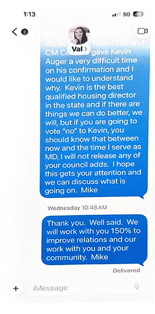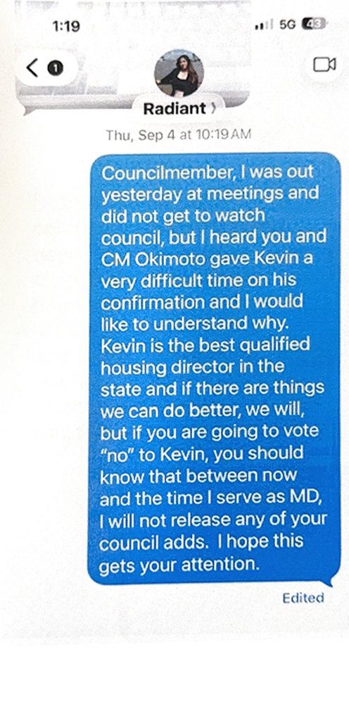 “Kevin is the best qualified housing director in the state and if there are things we can do better, we will,” Formby said in his text to Okimoto, “but if you are going to vote ‘no’ on Kevin, you should know that between now and the time I serve as MD, I will not release any of your council adds,” referring to community projects council members add to the budget each spring.