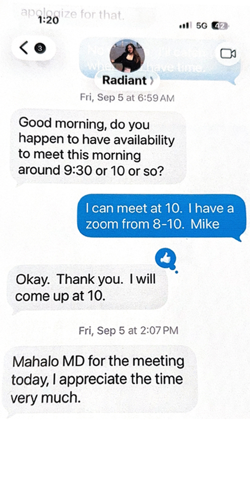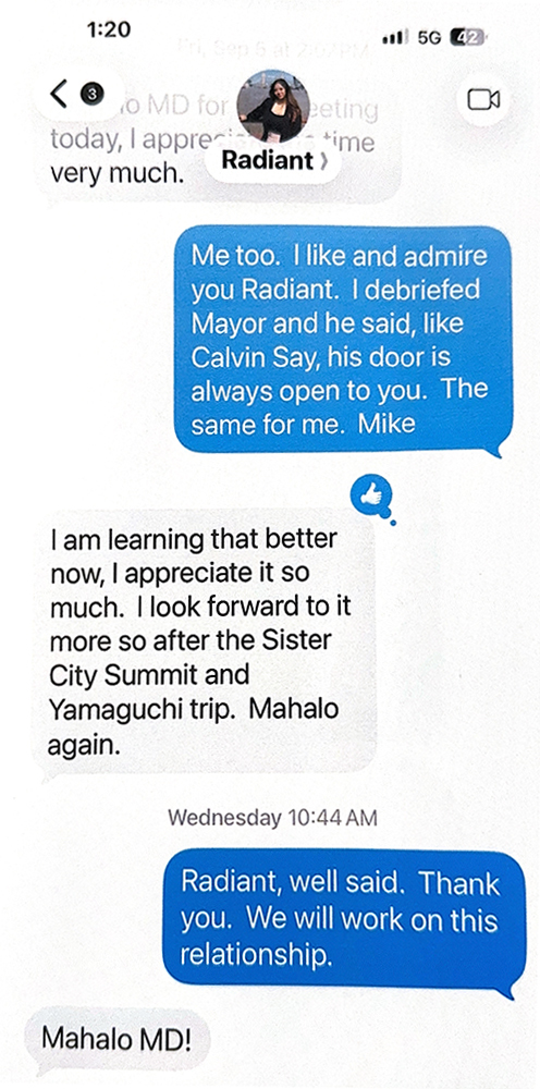 The texts’ existence remained private for months until Okimoto mentioned the interaction last week as the council voted to approve Kevin Auger as director of the Department of Housing and Land Management.