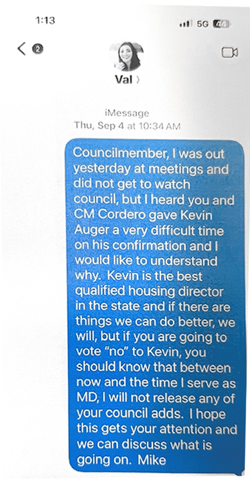 Cordero made a similar point in a written statement. “I was disappointed with the text message that tried to undermine my role as a Councilmember and disenfranchise the 120,000 neighbors I serve,” she said. “The message was unwarranted and unprofessional, and required my immediate attention.”