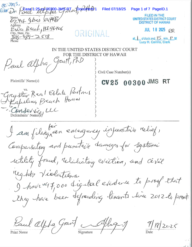 Grant’s latest 129-page court pleading is backed by hundreds of pages of exhibits, including bills and photographs of meter readings. A computer scientist by training, Grant says the ordeal has been a crash course in civil litigation going up against Greystar’s legal team from three firms, led by Calvert Chipchase, one of Hawaiʻi’s top land-use lawyers.
