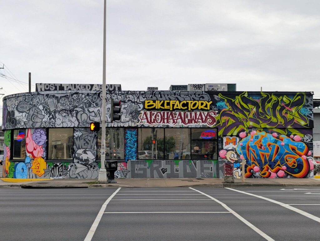 Within weeks, a collection of Hawai‘i’s best graffiti art emerged across the walls of the new BIKEFACTORY location, including a piece by Tonk. Some of the featured artists are known for leaving work on uncanny surfaces, even rappelling off buildings to do so. They are considered Hawai‘i’s “most wanted vandals,” embodying the rebellious spirit of graffiti art.
