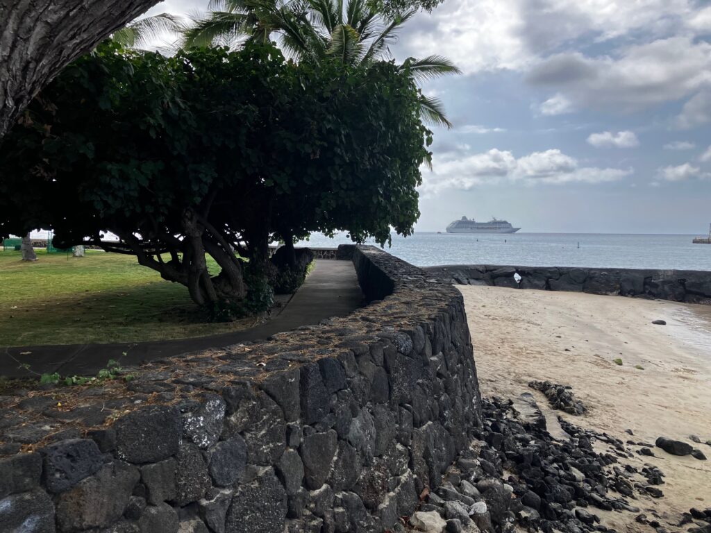 The palace is located near the path of the Ala Kahakai Trail, the storied 175-mile historic corridor that stretches around the western and southern parts of the island, the path taken in antiquity to link Hawai’i island’s villages and temple complexes. The palace property is directly on the waterfront, bounded by a seawall and a coastal walkway.