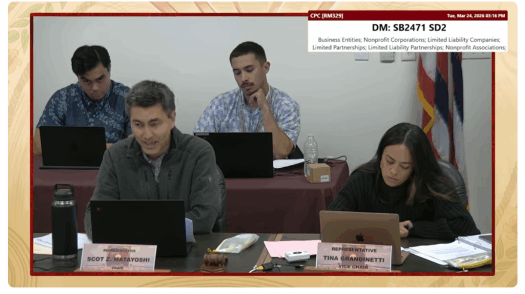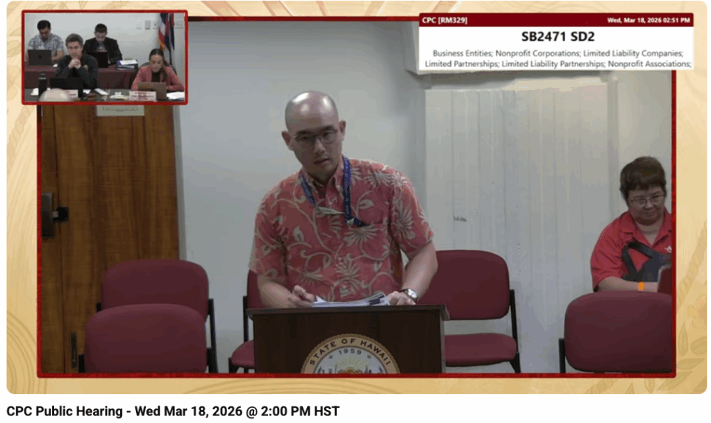 SB 2471 is still evolving. Rep. Scot Matayoshi, chair of the House Consumer Protection and Commerce Committee, amended it by deleting language that restricted the authorized purposes of nonprofit corporations to only charitable or public-benefit purposes.