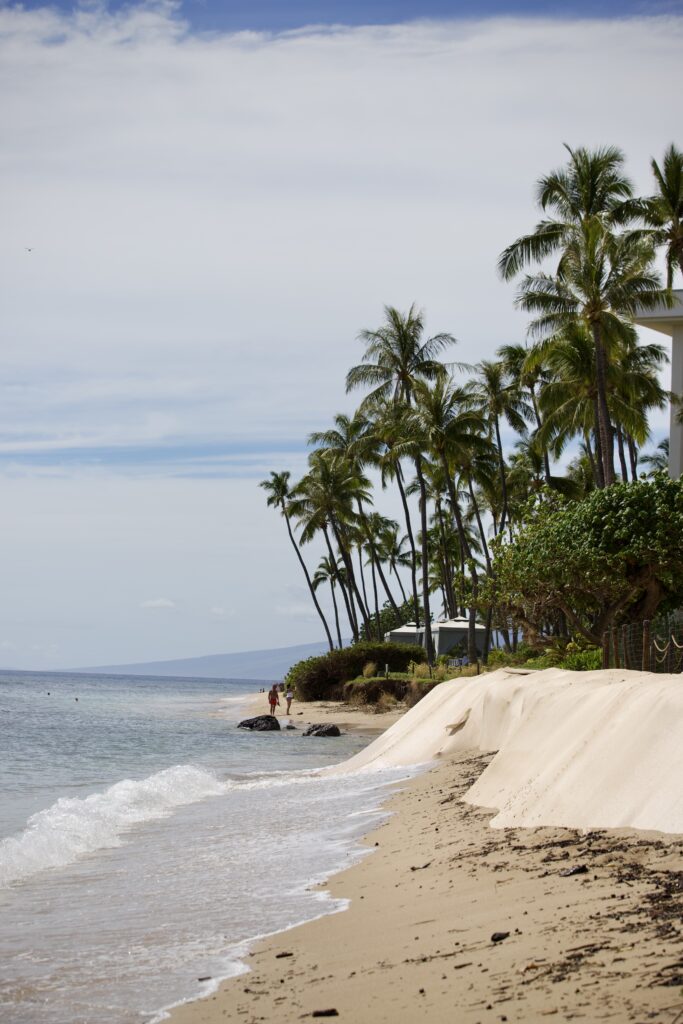 Kāʻanapali Beach — like many other beaches across Hawaiʻi — was ravaged by last month’s back-to-back Kona low storms. Raging floodwaters and violent waves dragged massive amounts of sand into the ocean, exposed utility lines and eroded away the earth beneath parts of the famed beachwalk that snakes between the beach and several resorts including the Hyatt.