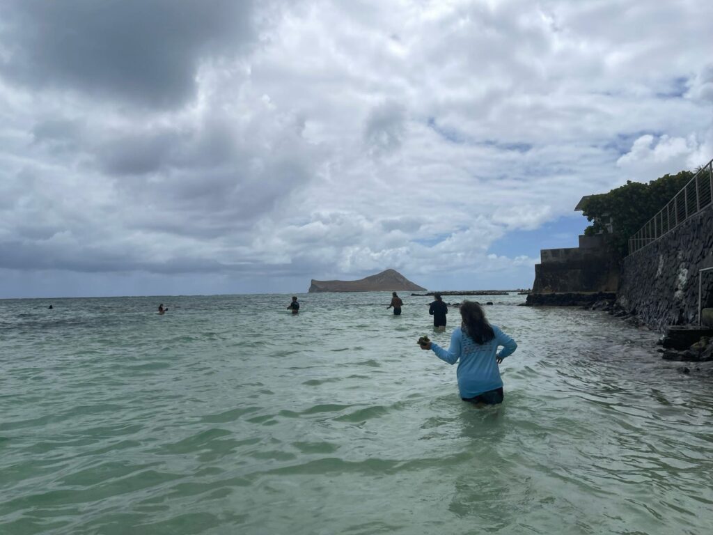 With about 5 feet of ocean around us, we dove to the floor and placed our lei in the sand. The stone would hold it fast from the currents. With the work now done, everyone seemed to loosen. They splashed around, made jokes, and eventually swam back to shore for potluck and walaʻau.