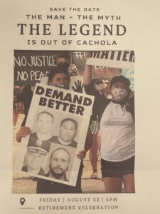 A flier for the party, Rhoads pointed out, featured a photo from a police protest with Cachola’s face alongside that of Derek Chauvin, the officer convicted of killing George Floyd in 2020 in Minnesota, and George Zimmerman, a Florida watch volunteer who shot and killed Trayvon Martin in 2012.